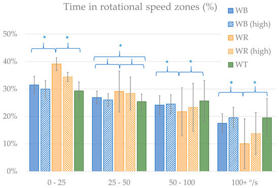 Distribution of time spent in rotational speed zones, with significant (p < 0.05) differences marked (*).