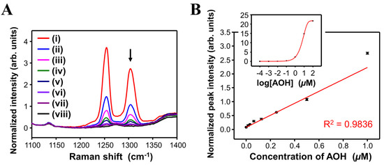 3.2. SERS Activity of SiO2@Ag NPs for AOH Detection