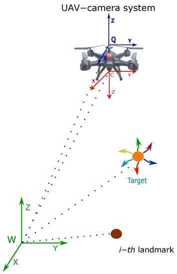 Additionally, let represent the position (in meters) of the target, with respect to the reference system W. Let represent the position (in meters) of the reference system C of the camera, with respect to the reference system W. Let represent the linear velocity (in ) of the target. Let represent the linear velocity (in ) of the camera. Finally, let be the position of the i-th landmark (in meters) with respect to the reference system W. In Equation (1), the UAV–camera system, as well as the target, is assumed to move freely in the three-dimensional space. Let note that a non-acceleration model is assumed for the UAV–camera system and the target. Non-acceleration models are commonly used in monocular SLAM systems. In this case, it will be seen in Section 4 that unmodeled dynamics are represented by means of zero-mean Gaussian noise. In any case, augmenting the target model to consider higher-order dynamics could be straightforward. Furthermore, note that landmarks are assumed to remain static.