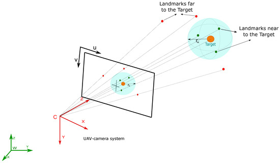 To determine whether a landmark is initialized with Euclidean or inverse depth parametrization, it should be determined arbitrarily if the landmark is considered near or far from the target. To achieve this objective the following heuristic is used (see Figure 3): (1) firstly, a spherical area centered on the target of radius is defined; (2) then, the radius of the projected spherical area in the camera is estimated; and (3) the landmarks whose projection in the camera are within the projected spherical area are considered near to the target and thus, they are initialized with Euclidean parameterization (see Section 4.1.1). Otherwise , landmarks are considered far from the target, and they are initialized with inverse depth parametrization (see Section 4.1.2) where .