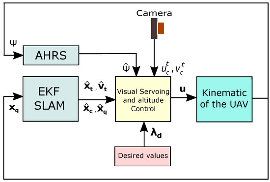 In this work, the standard EKF-based SLAM scheme [45,46] is used to estimate the system state in Equation (2). The architecture of the proposed system is shown in Figure 2.
