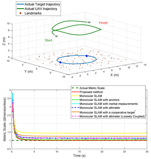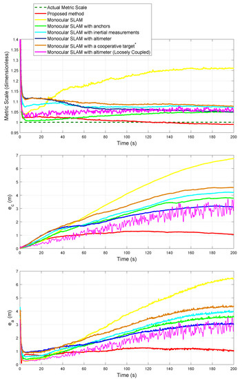 Nowadays, unmanned aerial vehicles (UAVs), computer vision techniques, and flight control systems have received great attention from the research community in robotics. This interest has resulted in the development of systems with a high degree of autonomy. UAVs are very versatile platforms and very useful for several tasks and applications [1,2]. In this context, a fundamental problem to solve is the estimation of the positions of UAVs. For most applications, GPS (Global Positioning System) still represents the main alternative for addressing the localization problem of UAVs. However, GPS comes with some well-known drawbacks associated with its use. For instance, in scenarios where GPS signals are jammed intentionally [3] or when the precision error can be substantial and they provide poor operability due to multipath propagation (e.g., natural and urban canyons [4,5]). Furthermore, there are scenarios where the GPS is inaccessible (e.g., indoor). Hence, to improve accuracy and robustness, additional sensory information, like visual data, can be integrated into the system. Cameras are lightweight, inexpensive, power-saving, and provide lots of information, moreover, they are well adapted to be integrated into embedded systems. In this context, visual SLAM methods are important options that allow a UAV to operate in an a priori unknown environment using only on-board sensors to simultaneously build a map of its surroundings while, at the same time, locating itself in respect to this map. On the other hand, perhaps the most important challenge associated with the application of monocular SLAM techniques has to do with the metric scale [6]. In monocular SLAM systems, the metric scale of the scene is difficult to retrieve, and even if the metric scale is known as an initial condition, the metric scale tends to degenerate (drift) if the system does not incorporate continuous metric information.
