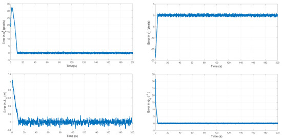 It can be verified that the right nullspace basis of spans for , (i.e., ). From Equation (12) it can be observed that the unobservable modes are related to the global position in x and y of the UAV–camera system, the landmarks, and the target. In this case, the rest of the states are observable. It should be noted that adding Lie derivatives of higher-order to the observability matrix the previous result does not improve.