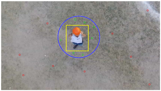 Figure 14 shows a frame taken by the UAV on-board camera. The detection of the target is highlighted with a yellow bounding box. The search area of landmarks near the target is highlighted with a blue circle centered on the target. For the experiment, a radius of 1 m was chosen for the sphere centered on the target that is used for discriminating the landmarks. In this frame, some visual characteristics are detected in the image. The red cercles indicate those visual features that are not within the search area near the target, that is, inside the blue circle. Instead, the green circles indicate those detected features within the search area. The visual features that are found within the patch that corresponds to the target (yellow box) are neglected, this behaviour is to avoid considering any visual feature that belongs to the target as a static landmark of the environment.