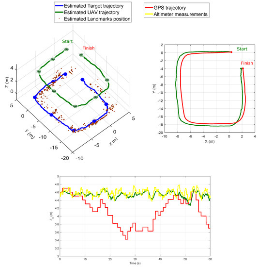 Figure 15 shows both the UAV and the target estimated trajectories. This figure also shows the trajectory of the UAV given by the GPS and the altitude measurements supplied by the altimeter. Although the trajectory given by the GPS cannot be considered as a perfect ground-truth (especially for the altitude), it is still useful as a reference for evaluating the performance of the proposed visual-based SLAM method, and most especially if the proposed method is intended to be used in scenarios where the GPS is not available or reliable enough. According to the experiments with real data, it can be appreciated that the UAV trajectory has been estimated fairly well.