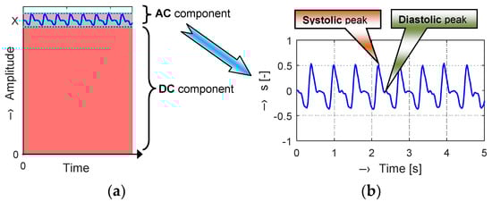 Principal structure of a photoplethysmographic (PPG) signal: (a) alternating current (AC) and direct current (DC) components superposition; (b) PPG volume pulse wave after signal processing (pre-filtering and DC component removal).