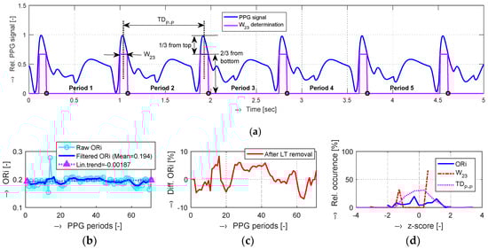 An example of PPG signal processing: (a) a 5 s region of interest (ROI) of a down-sampled signal after application of the absolute value operation (originally recorded at fs = 2 kHz, total time duration was 72 s) with localized peaks and determined parameters W23 and TDP-P; (b) raw and filtered Oliva–Roztocil index (ORi) values with the finally calculated linear trend (LT) of the whole PPG signal record; (c) differential ORi after LT removal; (d) histograms of z-scores calculated from the ORi, W23, and TDP-P values.