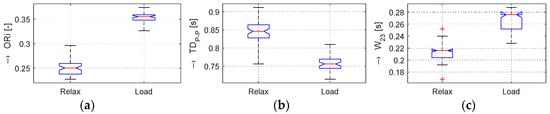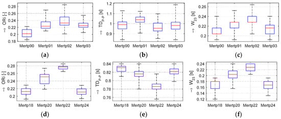 In the frame of our experiments, the ORi, HR, and BP parameters calculated from the pre-processed PPG signal were analyzed; the determined changes were quantified; and the obtained results were visualized and numerically compared. From the principal point of view, the changes in the calculated ORi are inversely proportional to the period TDP-P between the peaks of the systolic blood pressure, as demonstrated by the box-plot of basic statistical parameters in Figure 4. From the literature [,], it follows that the typical ORi range lies in the interval of <0.1, 0.3> for healthy people in a normal physiological state. Principally, three possible relations between TDP-P and W23 parameters can practically occur: