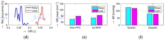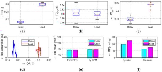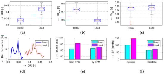 Changes in evaluated human cardiovascular parameters determined in Relax and Load phases with raising BP values and practically unchanged HR values: box-plot of basic statistical parameters of (a) ORi, (b) TDP-P, and (c) W23 values; (d) comparison of histograms of ORi values; (e) bar-graphs of HR determined from the PPG signal and measured by the BPM device; (f) comparison of systolic and diastolic blood pressure values; female person.