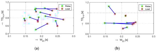 The obtained results are structured by three basic types of experiments mentioned in the previous paragraphs. This means that the sets of graphs in Figure 5, Figure 6 and Figure 7 represent the results for basic statistical parameters of ORi, TDP-P, and W23 values, together with differences of HR and ORi values determined from PPG signals recorded in relaxation as well as stimulation phases together with manually measured values of BP. The main results of the ORi parameter were then divided according to rise/fall of the measured HR or the systolic BP. The summary results—mean and standard deviation (std) of percentage differences between values in relaxation and stimulation phases depending on the gender of all tested persons during auxiliary and preliminary experiments—can be seen in Table 2. The graphical comparison of mutual positions of TDP-P and W23 parameters determined in the Relax and Load phases is presented in Figure 8. Figure 9 shows the visualization of changes of these parameters in the stimulation phase while hearing the MRI noise through headphones. Finally, the graphical comparison of the obtained differences measured directly in the scanning area of the MRI device is shown in Figure 10 and the numerical evaluation of all three parameters of the human cardiovascular system is summarized in Table 3, Table 4 and Table 5.