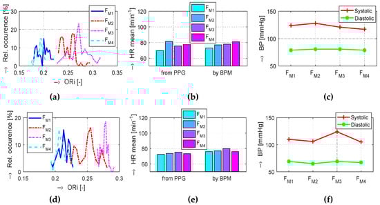 Visualization of changes of cardiovascular parameters determined in the initialization/relaxation (FM1, FM4), and after the stimulation phase while hearing the MRI noise through headphones (FM2, FM3), for a male (upper graphs) and a female (bottom graphs) tested person: (a,d) comparison of histograms of ORi values, (b,e) bar-graphs of HR determined from the PPG signal and measured by the BPM device, (c,f) comparison of systolic and diastolic blood pressure values.