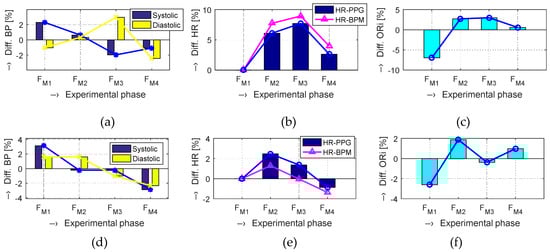 Comparison of differential values in [%] measured by the BPM device and determined from the PPG signal for a male (upper graphs) and female (bottom graphs) tested person lying inside the magnetic resonance imaging (MRI) device during execution of the MR scan sequence: (a,d) BP values in four measuring phases; (b,e) HR values determined from PPG and measured by BPM, related to the FM1 as a baseline; (c,f) mean ORi values (after LT removal).