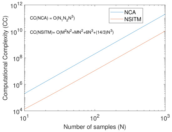 A logarithmic plot to illustrate a comparison between the computational complexity (CC) of NCA and NSITM, with the variations of number of samples (N), assuming , , and .