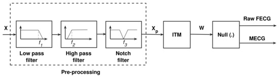 Raw FECG and MECG extraction system. The cut-off frequencies , , and are 100 Hz, 0.5 Hz, and 50/60 Hz.
