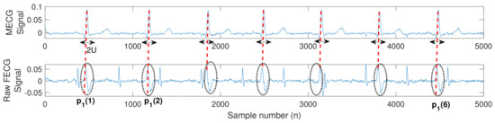 Typical extracted MECG and raw FECG signals from the system shown in Figure 2. The red dashed lines and the black dotted circles represent the locations () and the components of the unwanted MECG signals in the raw FECG signal, respectively. The doubled black arrows indicate the locations of the adaptive comb filter (ACF), of length , required to remove the MECG components.