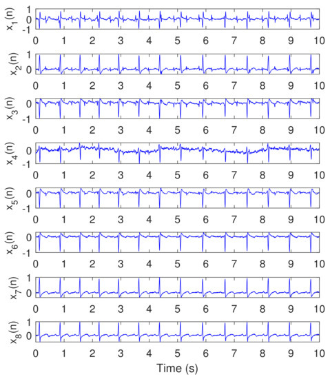 Recorded ECG signals using DAISY data set, , , Hz. The abdominal signals are the first five signals from the top (– while the remaining three (– are thorax signals.