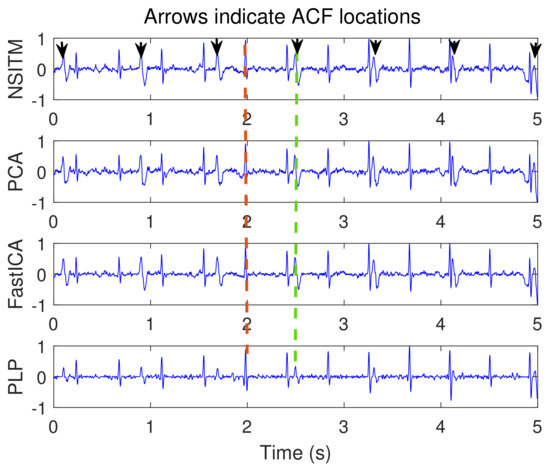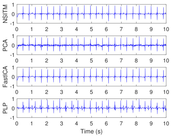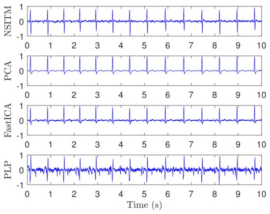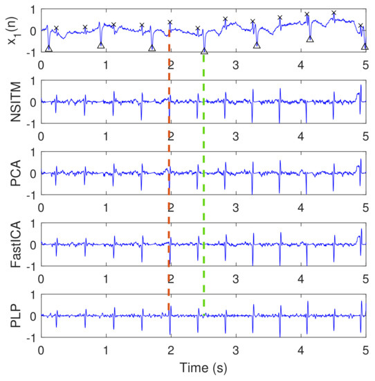 Figure 12 illustrates the clean extracted FECG signals of Figure 10 after the removal of MECG signals by ACF. The first signal from the top is the abdominal ECG signal , which is considered at the top of the figure for illustration purposes, since it contains the reference annotation taken from LightWAVE annotation viewer [45]. It is clear from Figure 12 that the proposed NSITM algorithm, the PCA algorithm, the FastICA algorithm, and the PLP algorithm are effective in extracting the FECG and MECG signals from the ECG mixture. The extraction performances will be considered later in Section 5.3.