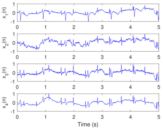 Recorded real ECG signals, from pregnant women for one minute, were used from the Physionet Challenge 2013 data set [45,46]. Each recording includes four noninvasive abdominal signals. The data were obtained from multiple sources using a variety of instrumentation with differing frequency response, resolution, and configuration. The sampling frequency for all data are 1 kHz. We selected the data files (a04, a08, a14, a15, a25) from the database, and used them in this experiment. Then, we followed the same simulation procedure as in Section 5.1. For illustration purposes, we visualize only the results of file a15 due to the excessive number of figures.