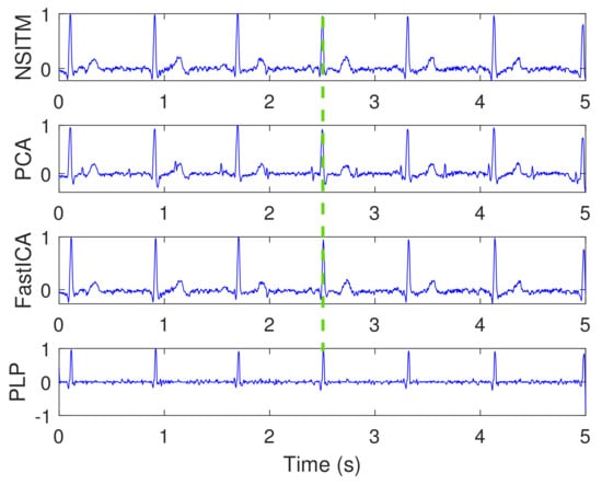 Extracted MECG signals from ECG signals in Figure 9, using NSITM, PCA, and FastICA, and PLP. Only MECG R peaks exist. For illustration, only one marked MECG peak is shown by green dashed lines. The y-axis labels refer to the names of the algorithms used for extracting the MECG signals. The data used are from the Physionet Challenge 2013 data set a, file a15.