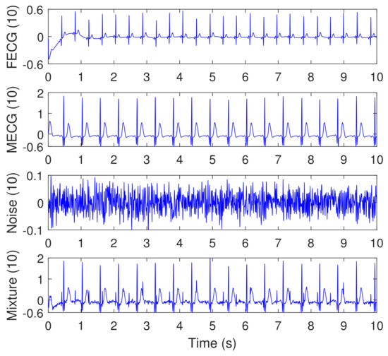 The biological ECG signal of a pregnant woman is a composite signal between the FECG, MECG, and the noise. It has been proven that the noiseless ECG signals can be modelled using the linear BSS model expressed by [8]: