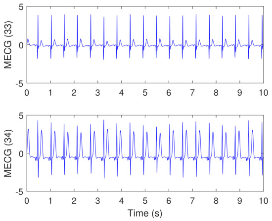 - As the data used in this experiment is noisy, the proposed NSITM algorithm and other algorithms used in this experiment, provide raw FECG signals that contain both FECG and MECG signals, as shown in Figure 10. Thus, the MECG components need to be removed using ACF. First, the MECG signals were extracted as shown in Figure 11. Then, the locations of R peaks in the MECG signal are estimated. These locations are used to adjust the ACF in order to remove the MECG components from the raw FECG signals.