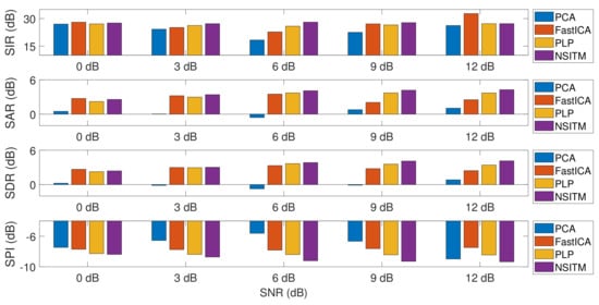- As illustrated in Figure 17, the average values of the extraction performances SIR, SAR, SDR, and SPI are significantly better for the NSITM algorithm than those results obtained using PCA, FastICA, and PLP algorithms, for SNR equal to 3 dB, 6 dB, 9 dB, and 12 dB. However, for SNR = 0 dB, the FastICA shows a slightly better performance. This is due to limited number of data, i.e., subjects, used in the experiment. An increasing amount of experimental data may show better performances using NSITM, as is the case for 3dB, 6 dB, 9 dB, and 12 dB. We used the available data to run this simulation.