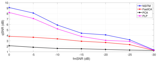 - At very low fmSNR, −30 dB, the proposed NSITM algorithm and other algorithms show the same low level of qSNR, which is equal to 1.29 dB. This is expected from all BSS algorithms at very low SNR.