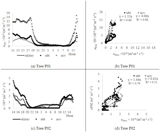 Values of sap flux density computed after the Biot approach (ubt, m3 m−2 s−1) and the conventional Granier approach (ucv, m3 m−2 s−1) in comparison with the sap flux density observed with the gravimetric test (uGrav, m3 m−2 s−1) on the sensor (Experiment I): (a) P01, circadian curves (26–27 March 2018); (b) P01, regression curve uGrav versus ubt and ucv; (c) P02, circadian curves (27–28 March 2018); (d) P02 regression curve uGrav versus ubt and ucv.