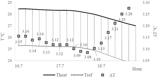Figure 5a illustrates a peak observed at hours 16 to 19 of the day that had been detached (Figure 6) for analysis. Figure 6 shows that ∆T values decreased, ranging initially from 3.16 to 3.08 °C, and at that point, increased up from 3.08 to 3.28 °C. This could be due to the dissonant thermal properties variation between and sensor places, caused by the surrounding disturbance, e.g., natural thermal gradients (NTG), as mentioned by [29], as well as, motion influenced by the wood thermal properties surrounding Gbt sensor.