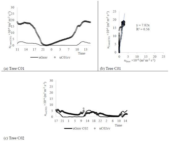 Sap flux density computed with the conventional Granier approach (ucv, m3 m−3 s−1) and that obtained with the gravimetric test (uGrav, m3 m−3 s−1) on the sensor (Experiment I): (a) C01, circadian curves (17–18 April 2018); (b) C01, regression curve uGrav versus ucv; (c) C02, circadian curves (18–20 April 2018).