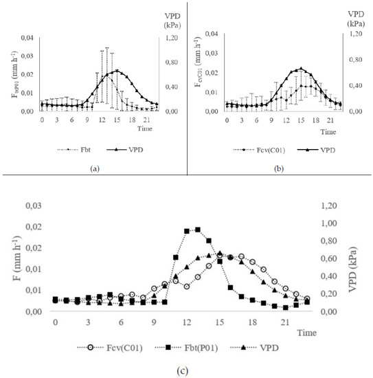 Figure 9a–c show the hourly mean values of the transpiration obtained with sensors P01(Fbt(P01), mm h−1) and C01(Fcv(C01), mm h−1) in comparison with the hourly mean values of the air vapour pressure deficit (VPD, kPa) estimates from data collected from 27 March to 18 April 2018. Fbt(P01), Fcv(C01) and VPD data were clustered on an hourly basis. The Fbt(P01) circadian curve is related to VPD estimates (Figure 9a). In fact, the low values of VPD (<0.66 kPa) are related to low sap flow rates, as it is verified in Fbt(P01). Also, Fcv(C01) (Figure 9b) presented satisfactory data consistency, when compared to the VPD circadian curve.