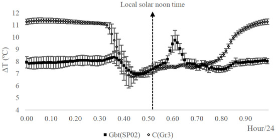 A peak was observed systematically around 14:00 h, after the local solar noon time (at 12:40 h) (Figure 10). Possibly, this was caused by stomatal closure, which reduced transpiration, therefore increasing . This mechanic stomatal closure, occurring soon after solar noon, is known to occur in olive trees as referred in [38], especially under stress conditions and vineyard [39,40]. The vineyard was not being irrigated on the days from 20 July to 28 August 2017, and it is likely to admit some water stress. In comparison, it was not observed any peak in the CGr3 sensor, given the low sensitivity to measuring the sap temperature.