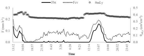 Figure 12 illustrates the circadian curves for the sap flow measurements with GbtSP32L sensor (Fbt, mm h−1) and the soil moisture obtained with the weighting device (mLy) in days 14–16 October 2016. The soil moisture data (θmLy, cm3 cm−3) obtained with mLy device showed to vary similarly to transpiration, showing the highest values simultaneously with the water redistribution into the soil, while the inverse occurs during the night. The explanation could be in the mLy device being subject under-canopy shading conditions. In [41], the authors suggested that the wind speed and the temperature variations within-canopy can affect energy and water balances since the canopy absorbs sensible heat from the soil, causing air temperature to decrease and a humid air accumulation. The humid air would be sourced from the high soil evaporation rate from the bare soil in days after rainfall events, verified in the day 287 (6.3 mm).