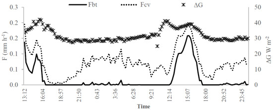 Figure 13 illustrates the circadian curves for soil heat storage (ΔG, W m−2) and sap flow approaches Fcv and Fbt in the days 14–15 October 2016. It can be inferred that the variation of the temperature differences measured into the trunk is related to the soil heat storage in a similar way for Fcv and Fbt estimates.