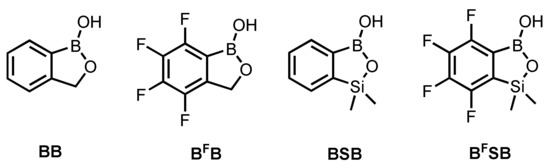 Recently, the synthesis and comprehensive characterization of benzosiloxaboroles bearing various functional groups such as halogens (X = F, Cl, Br), CHO, CH2OH, B(OH)2 was reported [11]. Antimicrobial activity of those derivatives was evaluated, and the structure–properties relationships were discussed. Interestingly, selected benzosiloxaboroles showed promising inhibitory activity against KPC-2 β-lactamase and the mechanism of action was studied theoretically [12]. Apart from the work devoted to the potential use of benzosiloxaboroles as antimicrobials, we have also performed studies on their affinity to selected molecules bearing cis-1,2-diol moiety. Preliminary results showed that fluorinated benzosiloxaboroles are effective receptors of biologically relevant diols including ribose, adenosine, and dopamine [10].