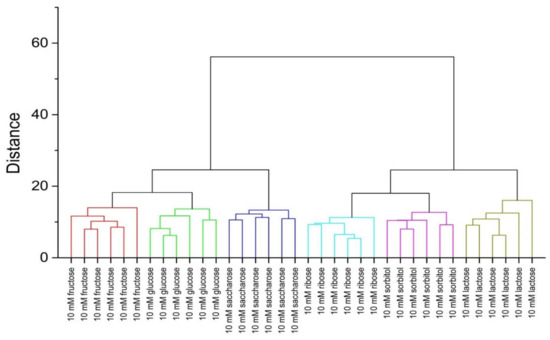HCA dendrogram for samples containing studied receptors, ARS, and saccharides (25 mM).