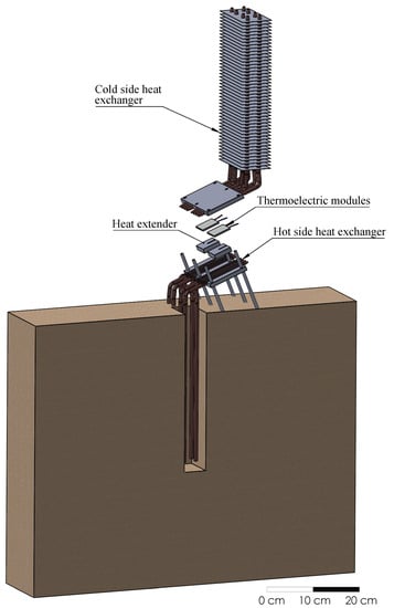While the most important element of a thermoelectric generator are the thermoelectric modules, heat exchangers become essential in order to maximize power generation. A reduction of 10% in the thermal resistance of the heat exchangers leads to an 8% higher generation []. In accordance with Catalan et al. [], who demonstrated that heat exchangers based on phase change are the most recommended ones for geothermal thermoelectric generators, the present paper includes heat pipes at both sides of the thermoelectric modules.