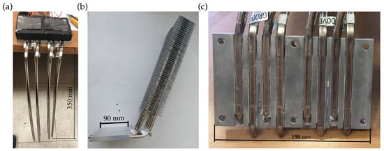The heat released by the thermoelectric modules is transmitted to the cold side heat exchanger, which is similar to the hot side one, except for the inclusion of 62 aluminum fins with a distance of 5 (Figure 2b). In this case, vaporization takes place in the lower part of the heat exchanger, in contact with the thermoelectric modules. The vapor ascends and condensates in the finned part of the tube. Since these fins allow increasing the exchange area with the windy environment, thus its thermal resistance decreases.