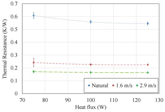 Figure 4 depicts the results of thermal resistance obtained for the different heat fluxes and environmental conditions studied. As can be observed, in all cases the thermal resistance decreases with increasing heat fluxes. This is the conventional behavior of phase change heat exchangers, since the properties of their internal working fluid improve with temperature, leading to a lower thermal resistance. Nonetheless, the biggest influence on the thermal resistance is caused by the exterior conditions, decreasing with higher wind velocities. In forced convection, thermal resistance is practically constant, presenting values of 0.22 and / with wind velocities of 1.6 and / respectively. In contrast, in natural convection a more pronounced dependency with respect to the heat flux can be observed, decreasing from a thermal resistance of / with 75 to / with 125 . The thermal resistance of the cold side heat exchanger can be divided into all the processes that occur within it: Conduction in the lower part of the tubes, boiling, condensation, conduction in the upper part of the tubes and the fins, and convection.