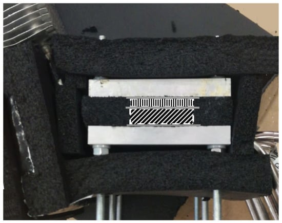 Detail of the neoprene layers installed covering the aluminum plates. On the figure, a drawing of the position of the heat extenders (with diagonal lines), the thermoelectric modules (with vertical lines) and the graphite sheets (in filled gray) has also been added.