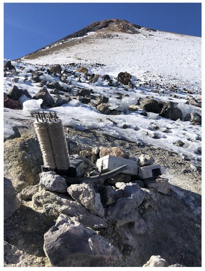 The prototype was installed on 15th March 2019 at Teide volcano, the most emblematic volcano at the Canary Islands (Spain). In particular, it was installed closed to “La Fortaleza” lookout, located at an altitude of approximately 3500 , facing the northern part of the island (Figure 6 and Figure 7). In this location, there exist fumaroles with a temperature of 82 [,].