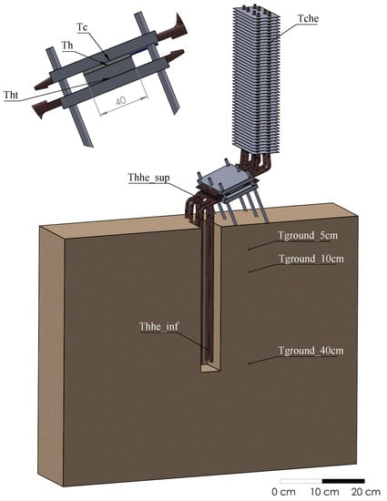 In the case of the hot side heat exchanger, two tubes were selected (again one per each module) and thermocouples were located in their lower and upper parts, at a depth of 35 in the ground () and in the bent part respectively (). In addition, two thermocouples measured the temperature at the base of this heat exchanger, before the heat extender introduced between the heat exchanger and the thermoelectric modules. These temperatures are also depicted in Figure 12. Firstly, it can be observed that the introduction of the heat extender causes a slight temperature loss in the hot side of the thermoelectric module, which is quantified at an average of 3 . In the case of not introducing it, the temperature of the hot side of the thermoelectric modules would slightly increase, but heat losses through thermal bridges will be higher, reducing total efficiency [].