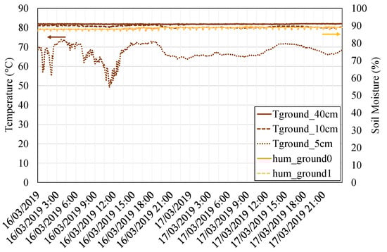 In addition, two shielded DTH22 sensors [] measured the ambient temperature ( and ) as well as the humidity ( and ). Ground humidity was also measured by means of two soil moisture sensors buried at a depth of 40 [].