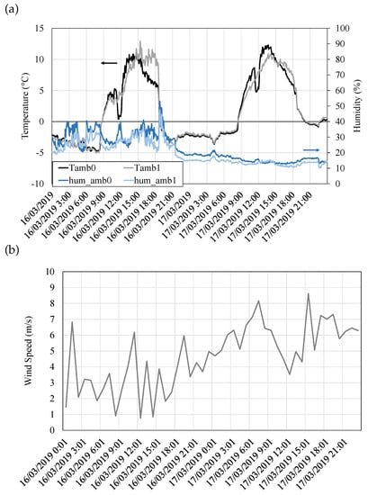 On the other hand, the conditions of the heat sink are shown in Figure 11. Ambient temperature (Figure 11a, left axis) varies throughout the day, with temperatures below zero during the night and up to 12 during the day. Slight variations between the sensors are due to their different locations. Figure 11a also depicts the relative ambient humidity in its right axis. Humidity does not follow a clear tendency and differs depending on the considered date. Hence, on 16th March, humidity constantly oscillates between 20 and 50%, while on 17th March, it stabilizes to an approximately constant value of 15%. In order to completely characterize the heat sink conditions, wind velocity has been represented in Figure 11b. These values of wind velocity were obtained from a weather station located nearby, which measured this value every hour. While it would be desirable to have more frequent measurements, the available data shows a typical variant smooth-moderate breeze with wind velocities that oscillate between 1 and 9 /, leading to forced convection in the cold side heat exchanger.