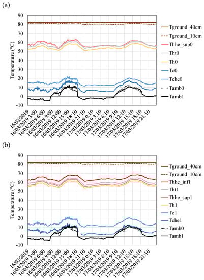 Temperature distribution of the prototype, separated into (a) the unsealed thermoelectric module and (b) the sealed one. represents the ground temperature measured at depths of 40, 10 and 5 cm; and are the temperatures in the lower and upper part of the hot side heat exchanger’s tubes respectively; is the temperature of the aluminum plate of the hot side heat exchanger; and represent the hot and cold side of the modules; is the temperature at the tubes of the cold side heat exchanger; and finally measures the ambient temperature.
