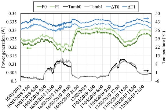 Once the temperature distribution has been analyzed, Figure 13 (left axis) shows the generation of the two thermoelectric modules, being the power generated by the unsealed module and the power corresponding to the sealed one. The sealed module had a greater temperature difference between its sides that translates into a slightly higher generation in comparison with the unsealed one. Apart from this slight difference, both modules follow a similar generation tendency, increasing their generation during the night and decreasing it during the day. In order to have a better perception of this fact, the ambient temperature and the temperature difference accross both modules have been also represented in the right axis of Figure 13. During the night, ambient temperature decreases and therefore, the temperature difference of the modules increases, leading to a higher generation, which in the sealed module reached up to while in the unsealed one, . During the day, the temperature difference decreases, and so does the generation, with values of around . This effect occurs with a small delay due to the thermal inertia of the different components. Furthermore, it can be also observed that a lower temperature does not necessarily imply a greater generation. During the night of 16th March, the ambient temperature was lower than on the 17th of March. However, generation on the latter is greater due to the higher wind velocity, which improves the convection of the cold side heat exchanger, leading to a lower thermal resistance.