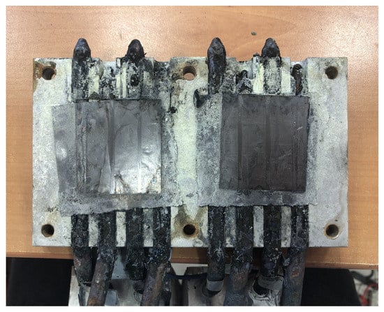 The heat pipe tubes that compose the prototype were also made of copper (nickel-plated), and therefore, signs of corrosion were also perceptible. Figure 15 shows the aluminum plate of the cold side heat exchanger after approximately one month of exposure to Teide’s volcanic environment. As can be observed, excepting the graphite sheet where the thermoelectric modules were placed, all the surface is covered by yellowish deposits of sulfur, despite the fact that it was protected with neoprene and adhesive tape. Hence, in order to achieve the objective of autonomous volcanic monitoring stations, it is important to take measures against the corrosion, protecting better the electronics with a protection of at least IP64 [], as well as using heat pipes made of more resistant materials such as steel or titanium [,], or with protective coatings [], so that they can resist better in this acidic environment.
