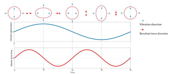 To illustrate why in Equation (3) and in Equation (4) do not affect the energy compensation of double-frequency parametric excitation, take the x-mode as an example. The equivalent effect of the electrode driving on the x-mode is: