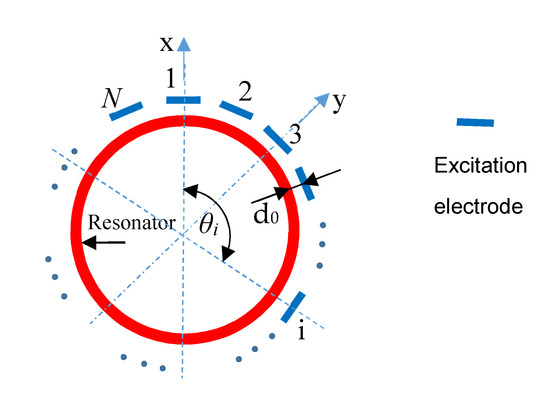 where is the capacitance which is composed of the single driving electrode and the resonator; the distribution of discrete electrodes is shown in Figure 3; is the average gap value of the single driving electrode and the resonator; N is the number of the excitation electrode; is the orientation of the i-th electrode, and ; is the voltage of the i-th electrode.