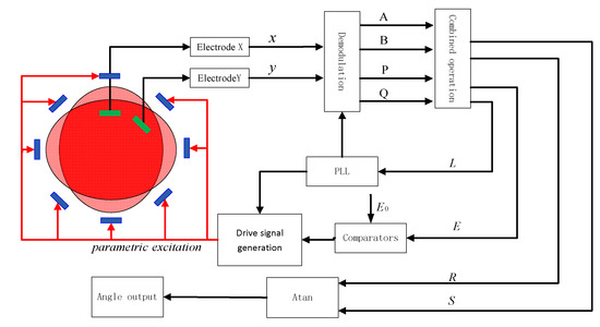 The main components of the control system of the HRG are the loop of demodulation, the loop of the frequency and phase tracking (PLL), and the loop of the amplitude control. To obtain the decision control of the HRG, signal x (0° detection electrode) and signal y (45° detection electrode) are respectively multiplied and demodulated with the reference signal to obtain the parameters A, B, P and Q, and obtain the decision content E, R, S and L by the filter [18,19]:
